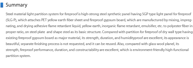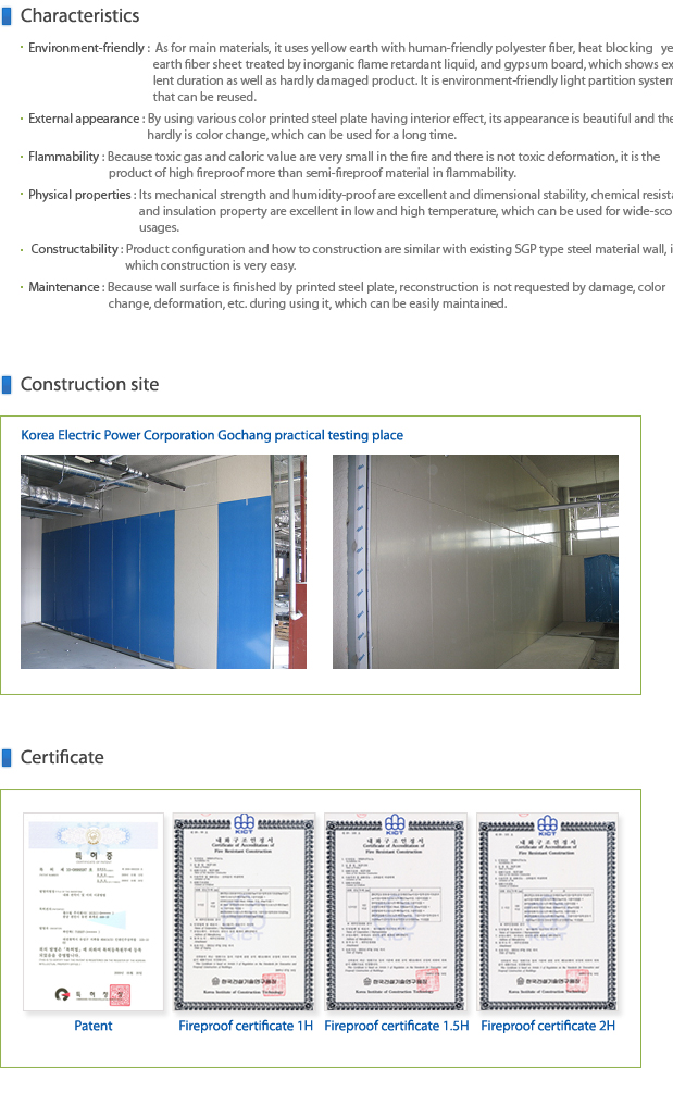 Structure: Double-sided S.L.G.P(steel plate + heat blocking fiber sheet + fireproof gypsum board 12.5mm) + STUD(fireproof gypsum board, heat blocking yellow earth fiber sheet), internal air layer